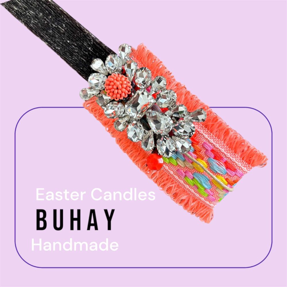 Χειροποιήτη Παχαλινή λαμπάδα τετράγωνη , μάυρη σαγρέ, με πορτοκάλί φλοούο ύφασμα και ένα πλαίσιο με στράς.