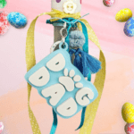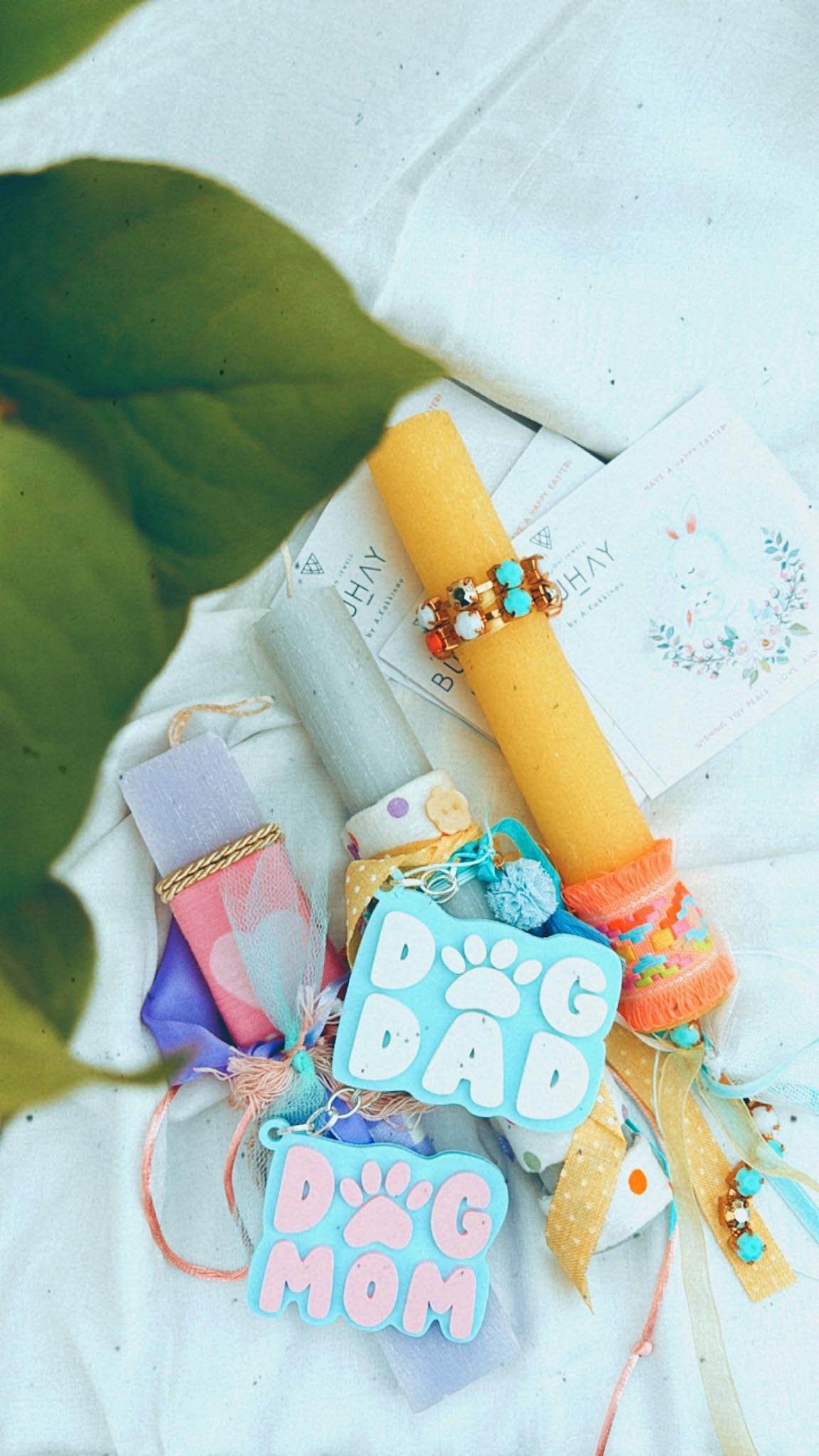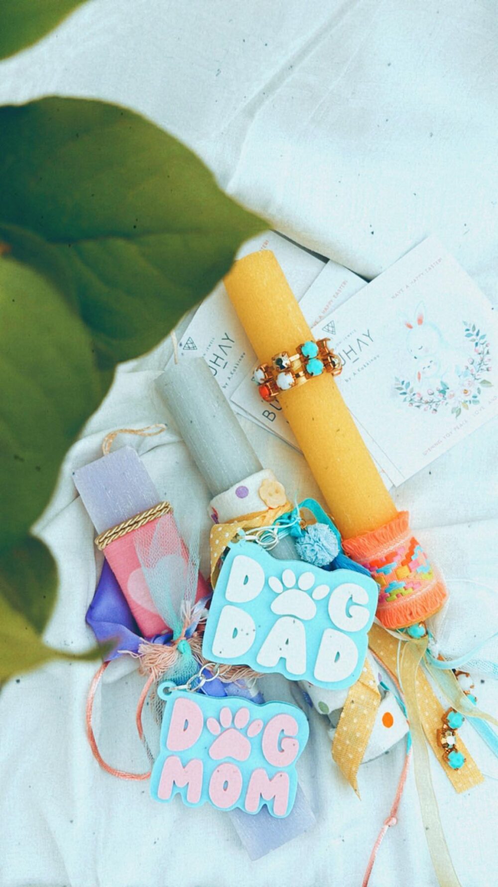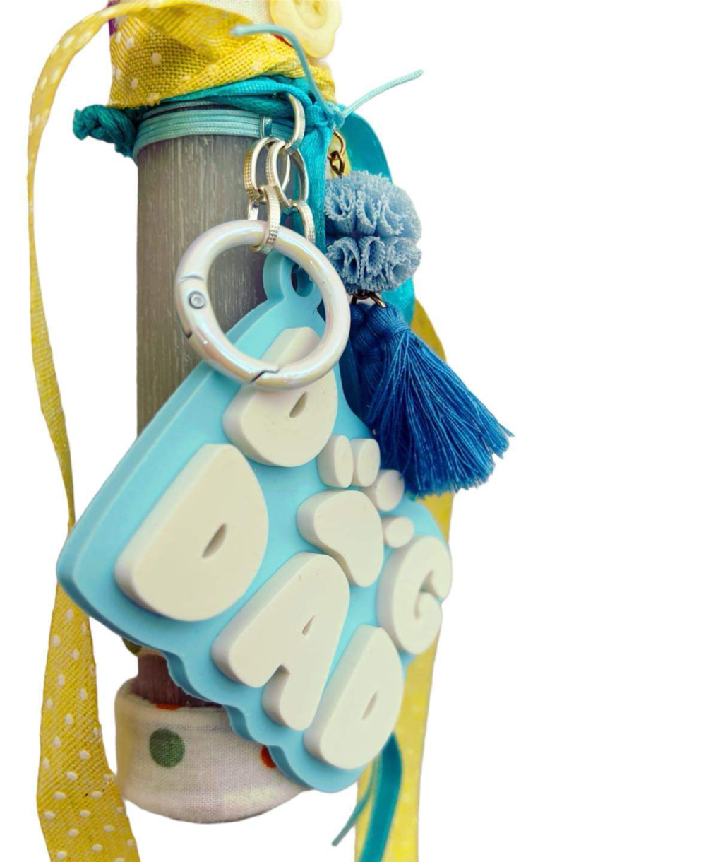Χειροποιήτη Πασχαλινή στρογγυλή σαγρέ λαμπάδα , με χειροποιήτο 3d μπρελόκ .
