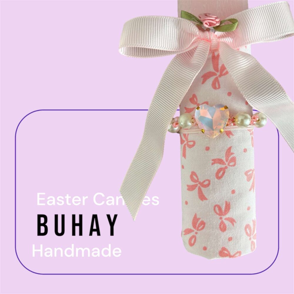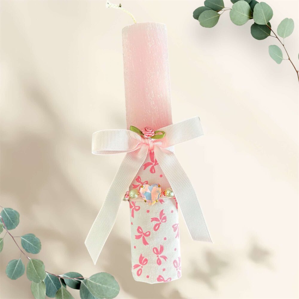 Χειροποιήτη Πασχαλινή λαμπάδα σχήμα δάκρυ ρόζ , σαγρέ, ντυμένη με ,λευκό ύφασμα με ρόζ φιόγκους ,ένα ρόζ φιόγκο με λουλουδάκι και αγκαλιάζει ένα βραχιολάκι με πέρλες και ζιργκόν.