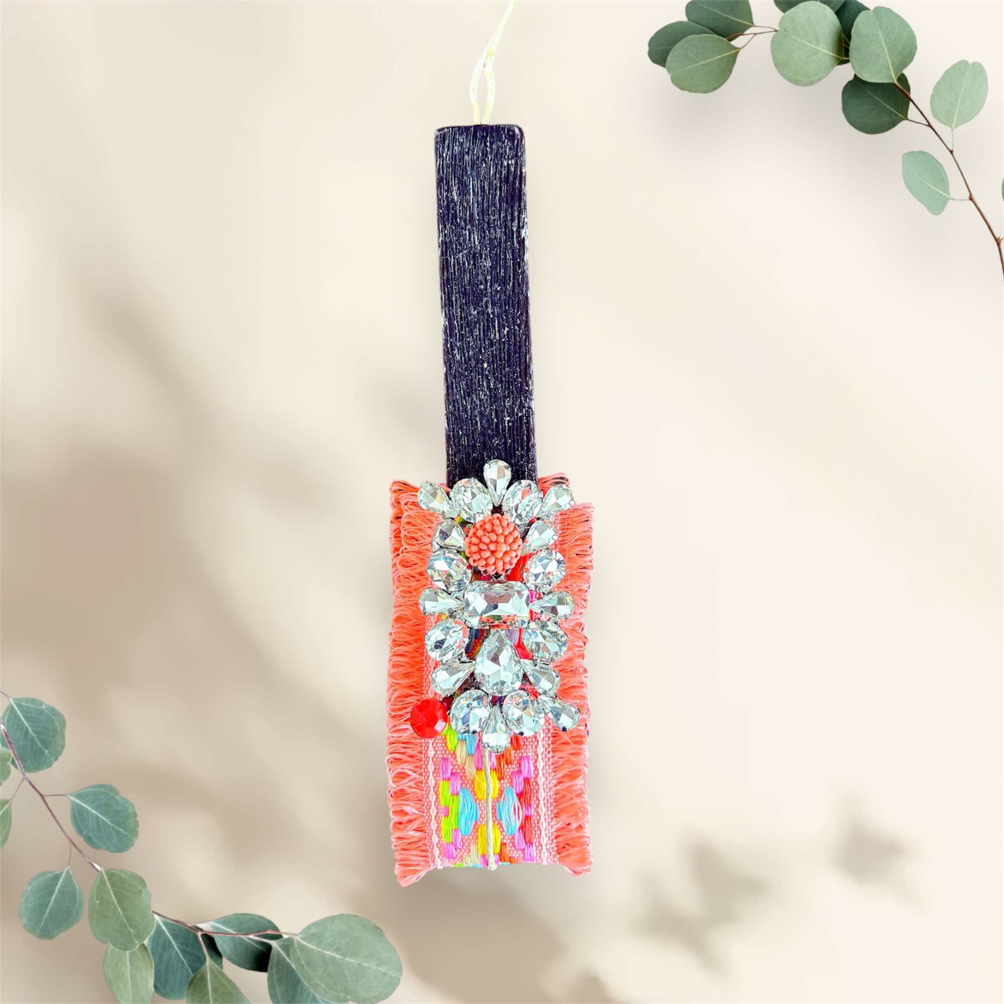 Χειροποιήτη Παχαλινή λαμπάδα τετράγωνη , μάυρη σαγρέ, με πορτοκάλί φλοούο ύφασμα και ένα πλαίσιο με στράς.