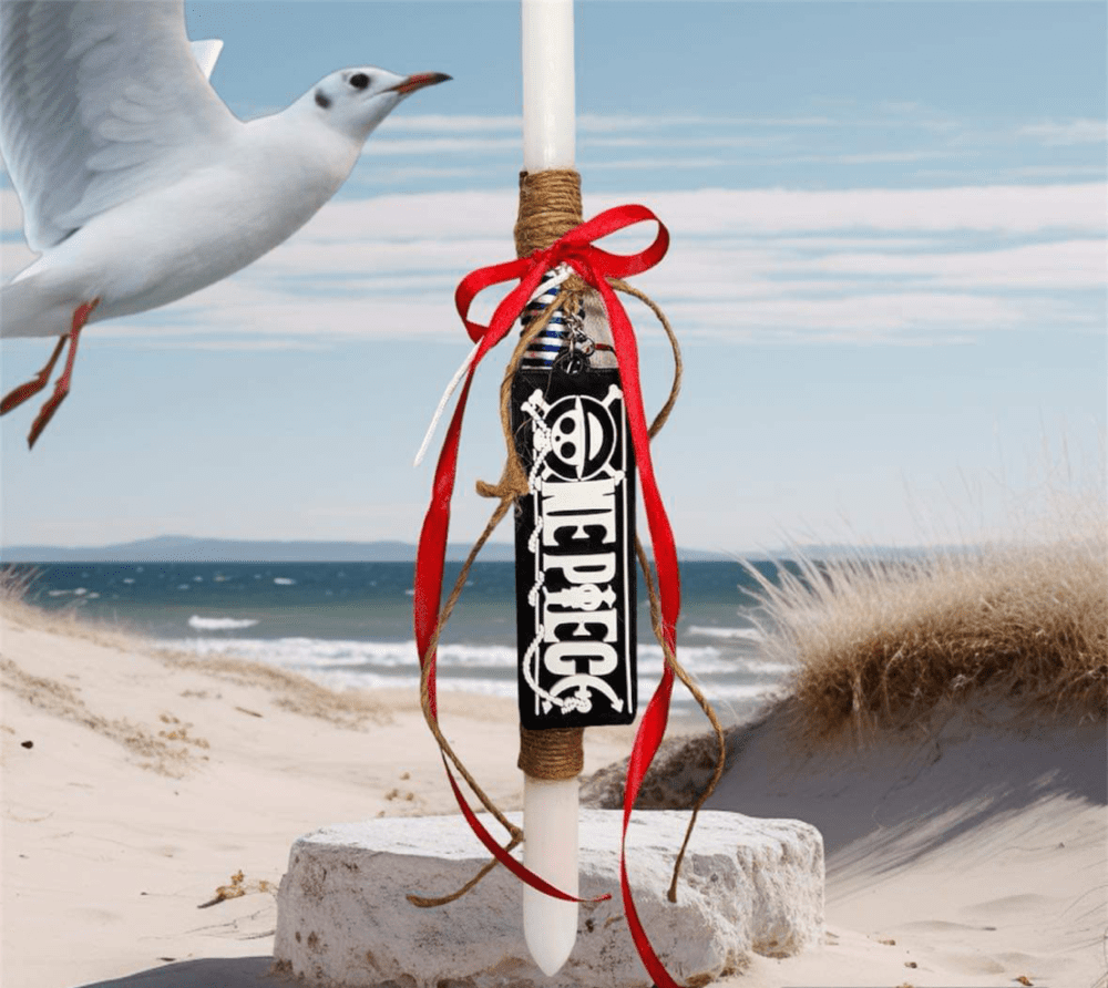 Πασχαλινή στρογγυλή λαμπάδα , με χειροποιήτο μπρέλοκ ONE PIECE.