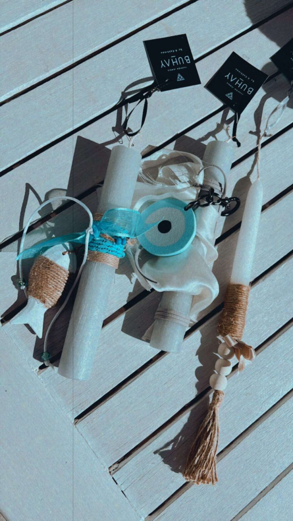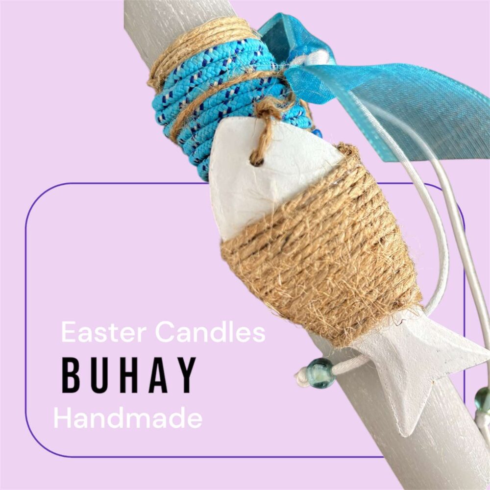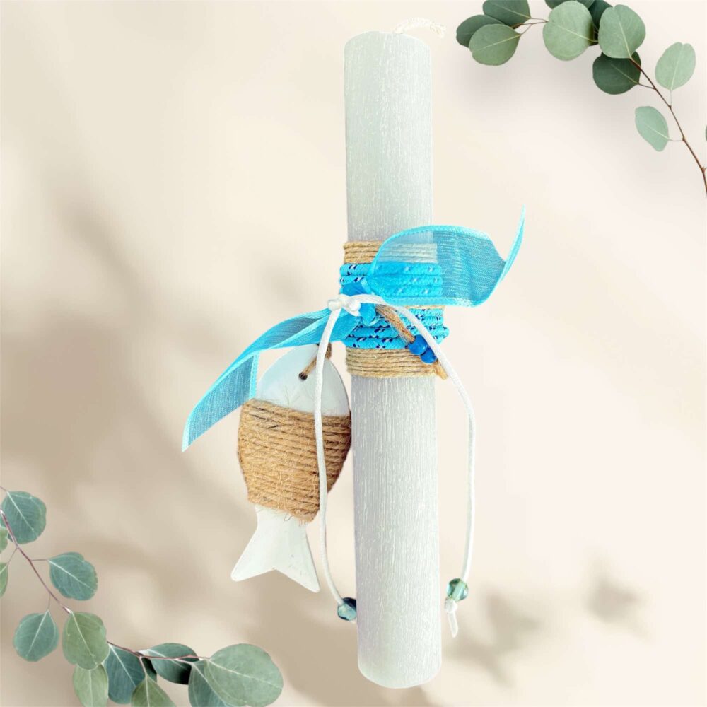 Χειροποιήτη Πασχαλινή λαμπάδα στρογγυλή γκρί , σαγρέ, με γαλάζιο ναυτικό κορδόνι και ενα διακοσμητικό λευκό ξύλινο ψαράκι .