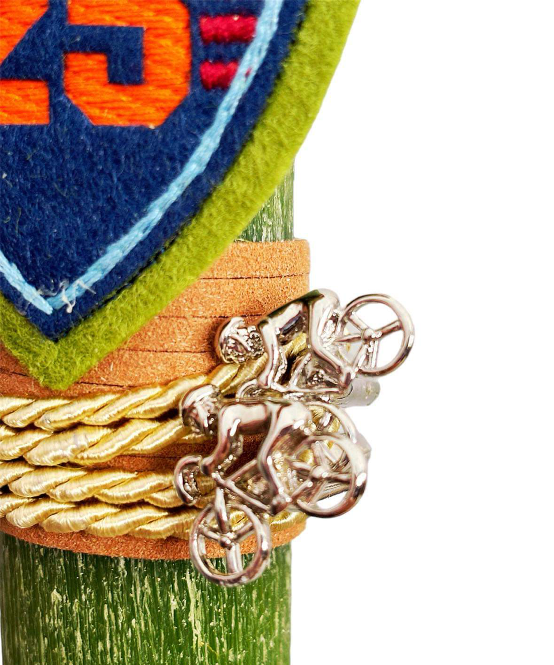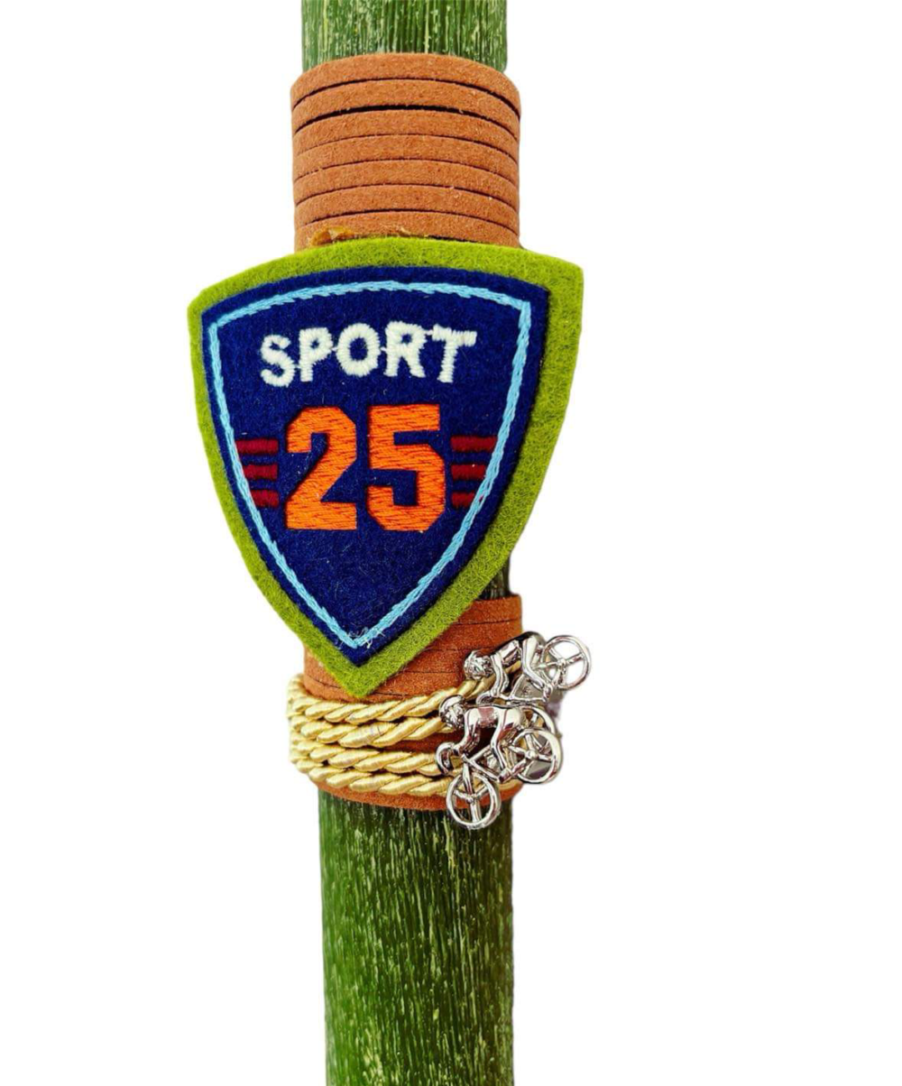 Χειροποιήτη Πασχαλινή στρογγυλή σαγρέ λαμπάδα , με υφασμάτινο διακοσμητικό και μανικετόκουμπα απο ανοξείδωτο ατσάλι σε σχήμα ποδηλάτη.