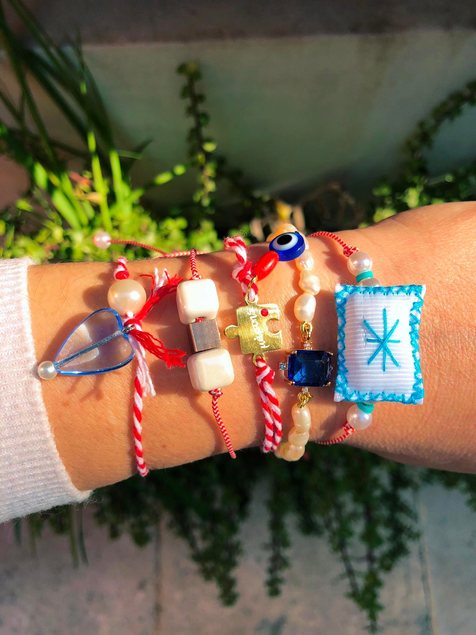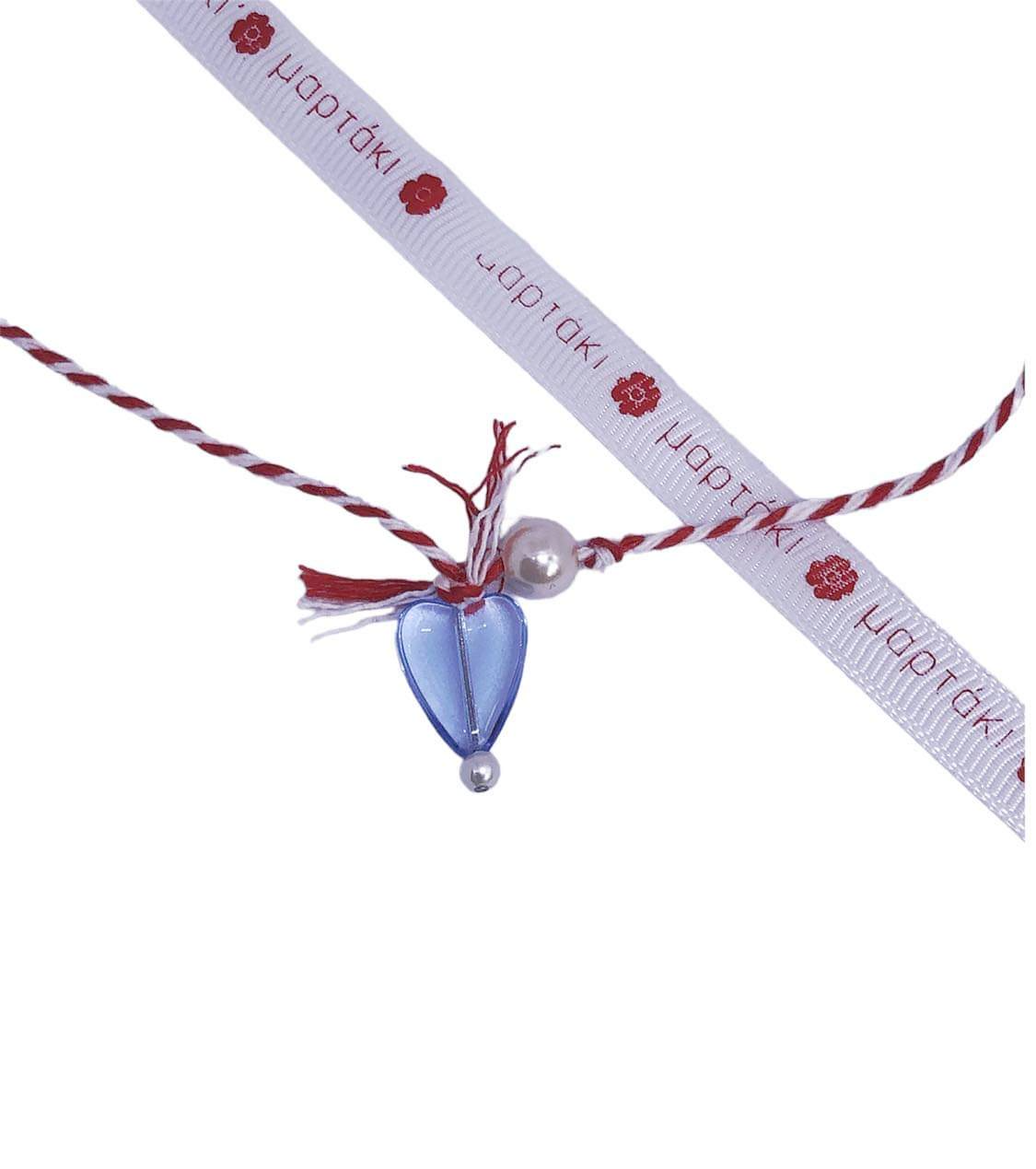 Χειροποιήτο μαρτάκι με πέρλα και μπλέ καρδιά .