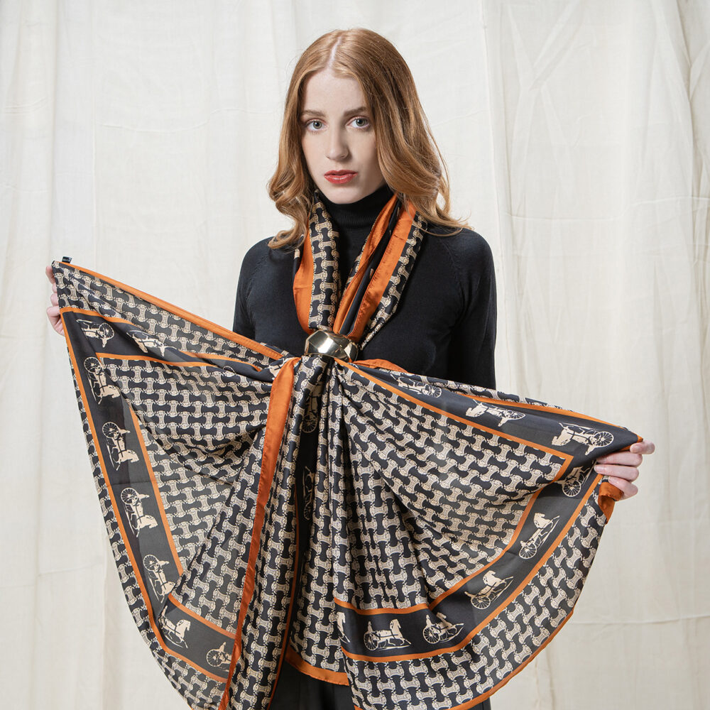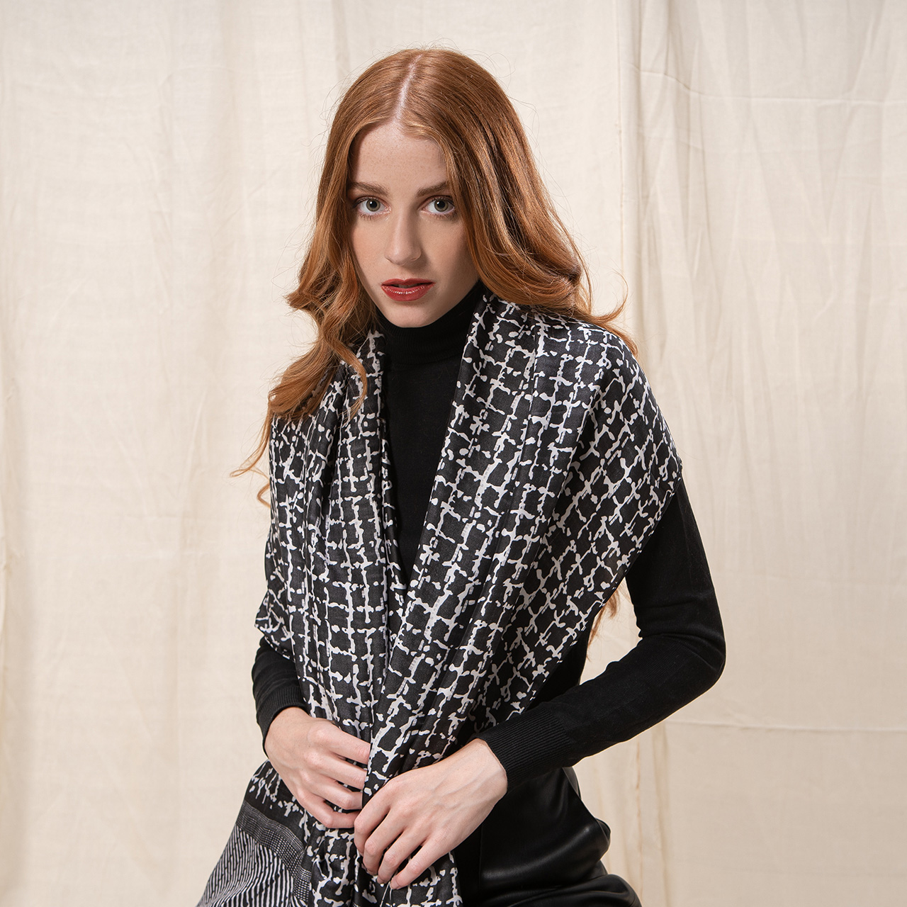 Μαντήλι με εμπριμέ σχέδιο σε σατέν υφή. Κλασικό και κομψό, θα συμπληρώσει τέλεια ένα chic look.