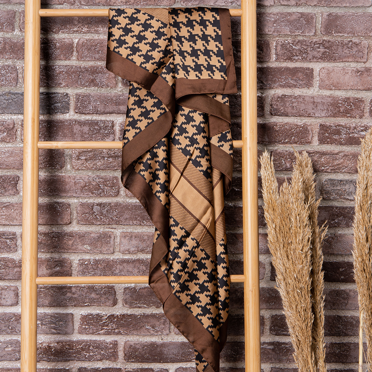 Μαντήλι τετράγωνο με σχέδιο pied de poule σε σατέν υφή. Ιδιαίτερα κομψή επιλογή για τις εμφανίσεις σας.