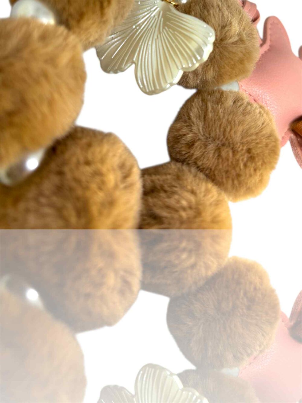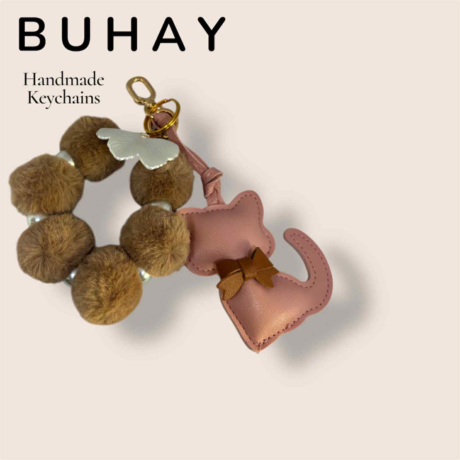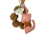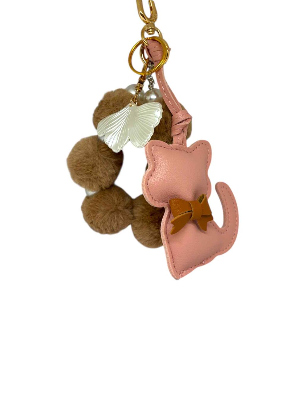 Χειροποιήτο μπρελόκ , ρόζ γατάκι απο οικολογικό δέρμα, μια σειρά με πέρλες με φουντίτσες και φίλντισι φυλλο.