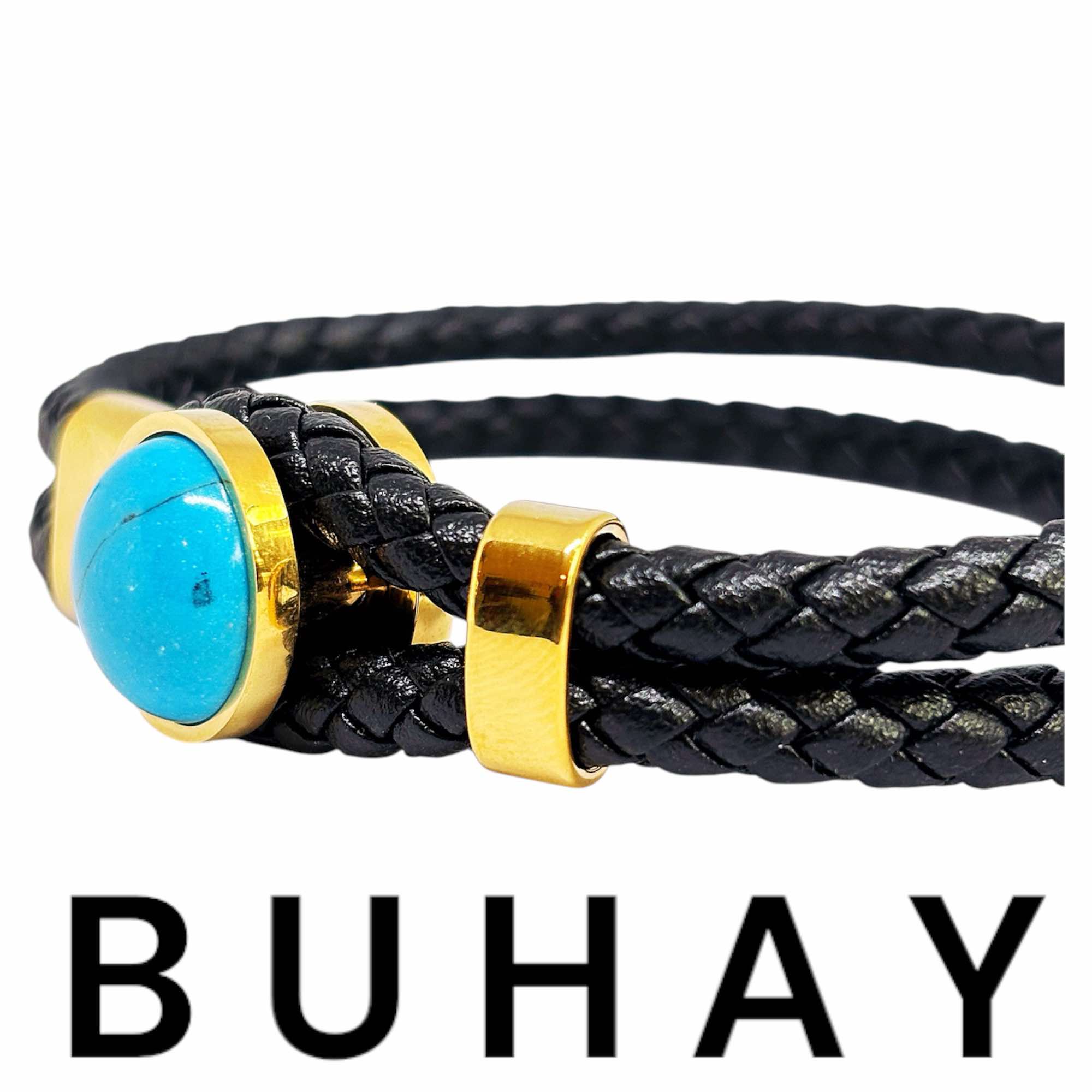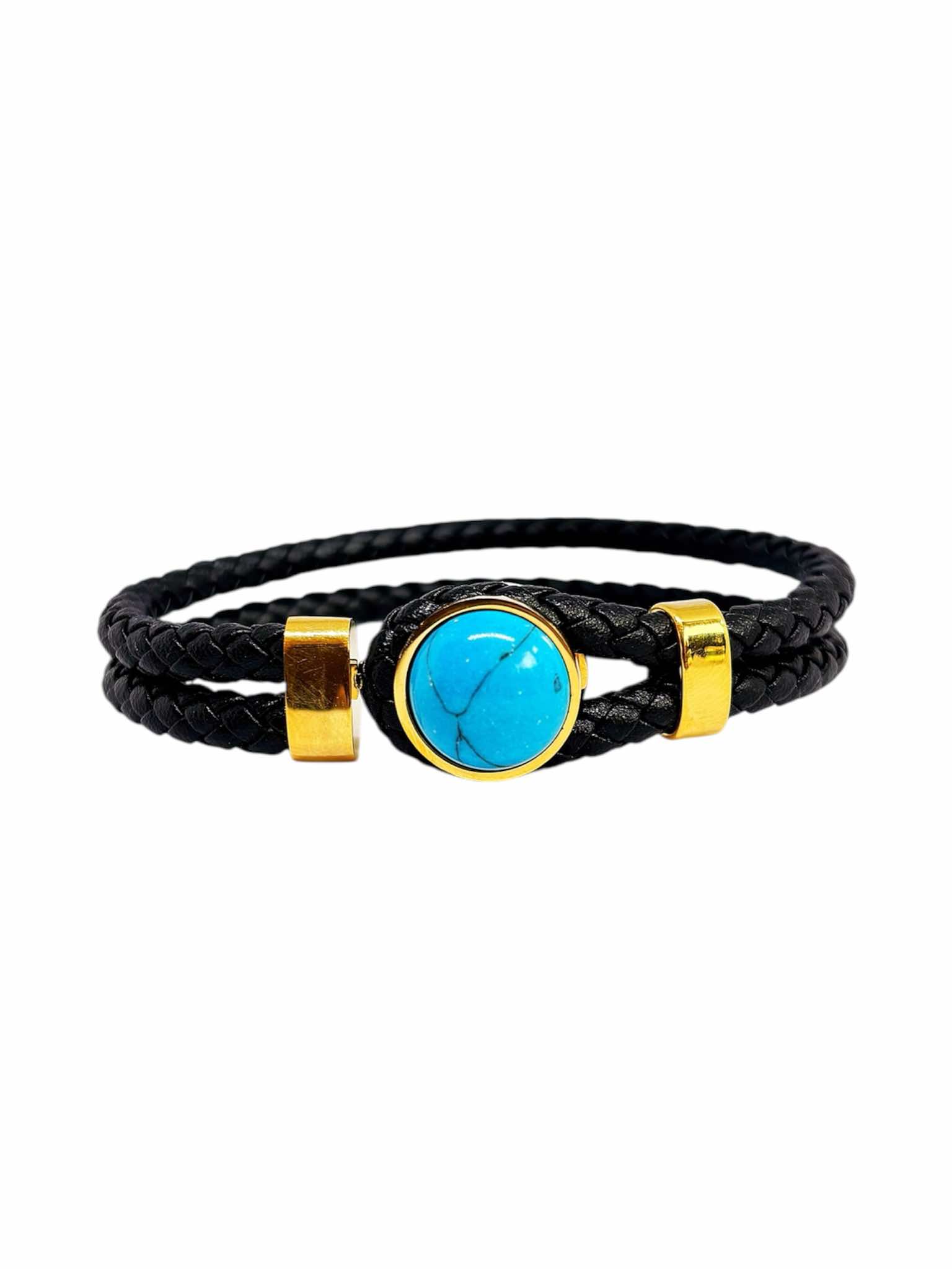 Αντρικό βραχιόλι απο ανοξείδωτο ατσάλι και μάυρο δέρμα πλεξούδα. Ιδιαίτερο κούμπωμα με στρογγυλή τιρκουάζ ημιπολύτιμη πέτρα.