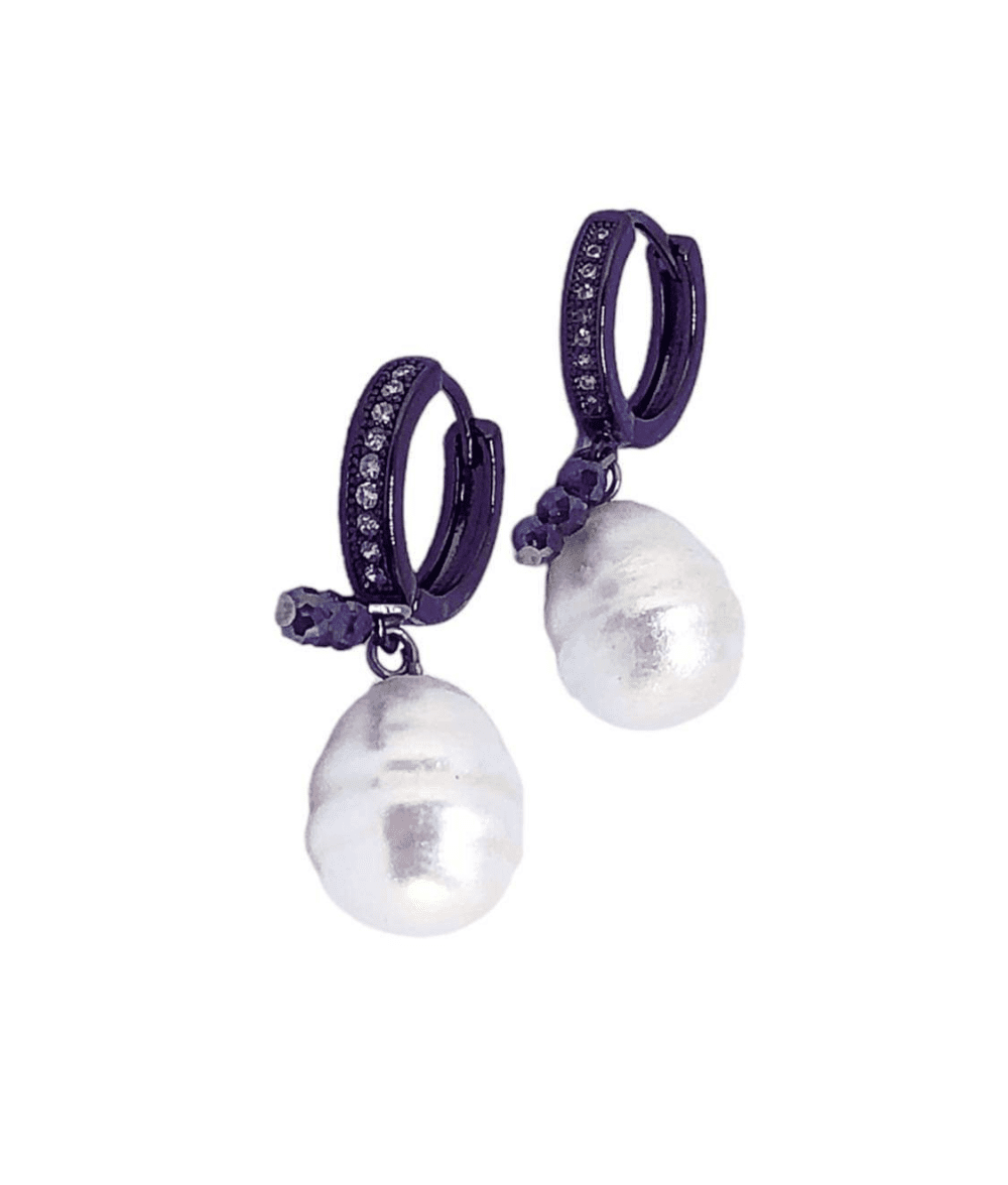 Χειροποιήτα σκουλαρίκια απο οικολογικό ορύχαλκο , με μαυρη πατίνα. Κρικάκια με ζιργκόν που κρέμεται μια πέρλα και κρυσταλλάκια .