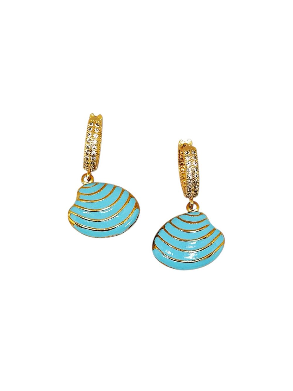 Χειροποιήτα σκουλαρίκα απο ανοξείδωτο ατσάλι , επιχρυσωμένα. Κρικάκια με ζιργκόν ,κρέμεται κοχύλι με γαλάζιο σμάλτο.