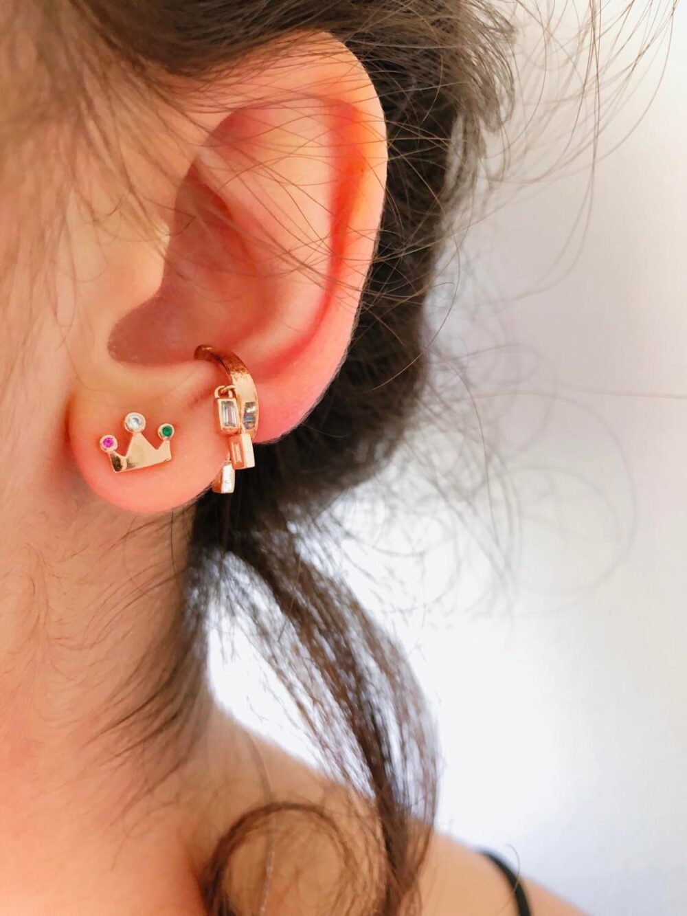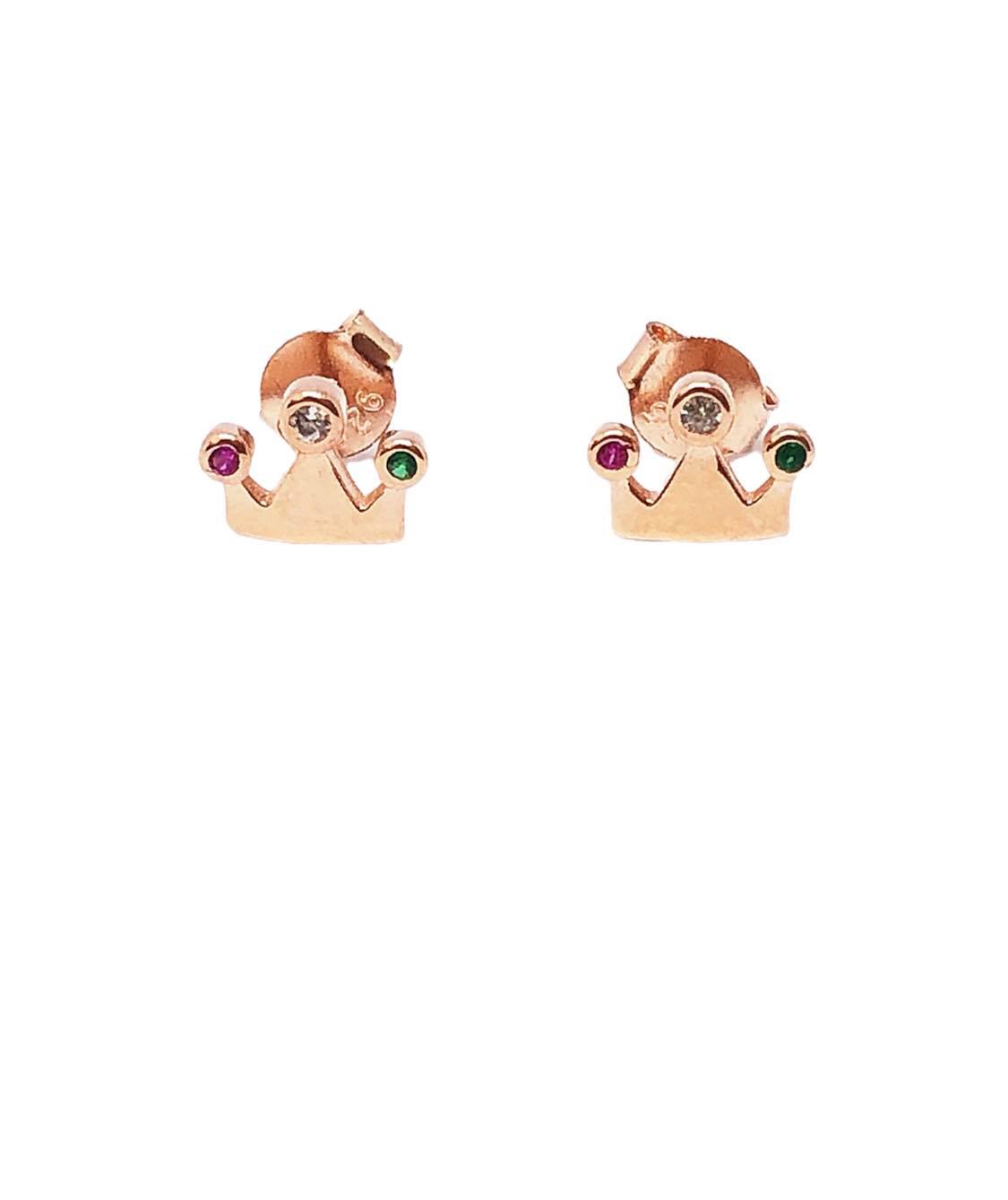 Σκουλαρίκια απο καθαρό ασήμι 925* με ροζ χρύσωμα. Σχήμα κορώνας με χρωματιστά ζιργκόν. Μέγεθος – Υ. 0.7 Π. 0.9 CM