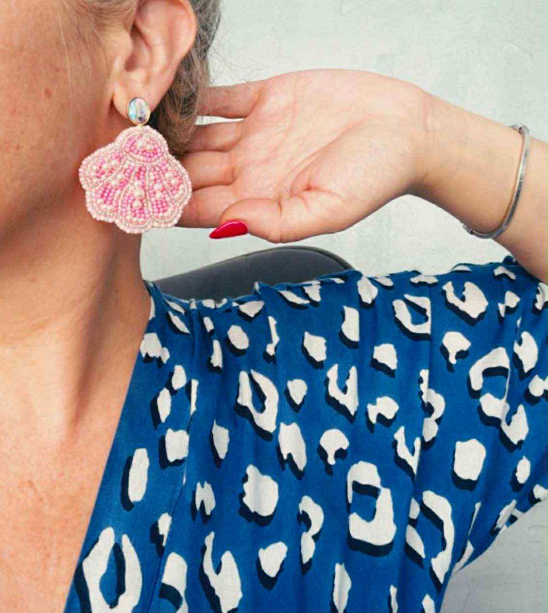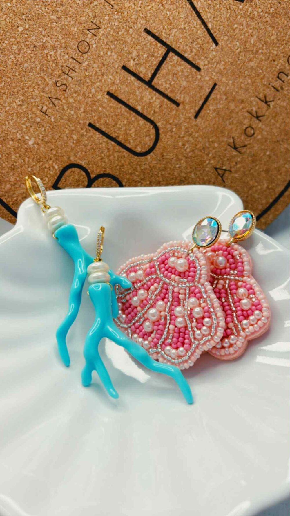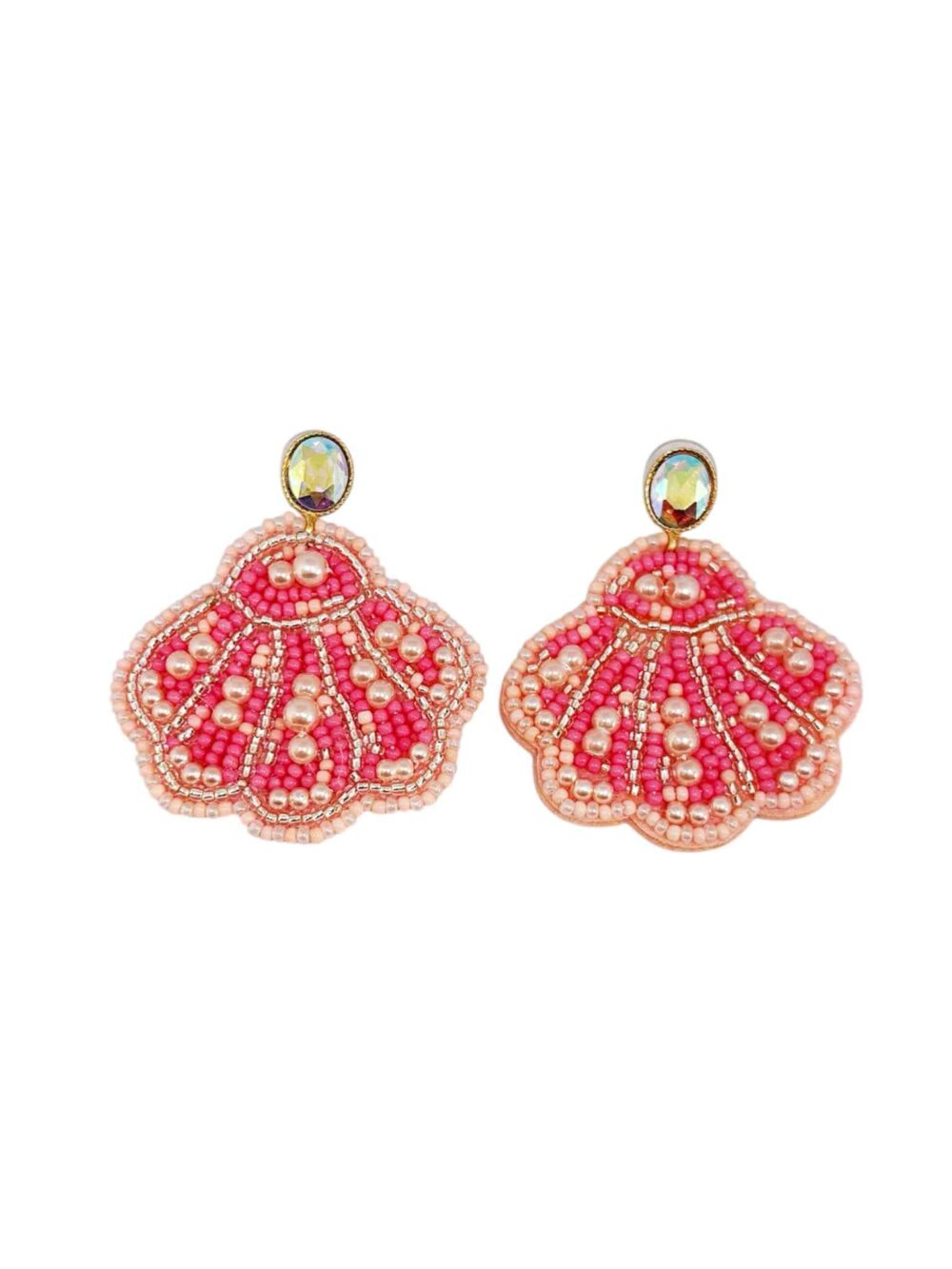 Χειροποιήτα σκουλαρίκια με υφασμάτινο ρόζ κοχύλι με περλίτσες και καρφάκια με οβάλ διαμαντέ ιριδίζον ζιργκόν , απο οικολογικό ορύχαλκο.