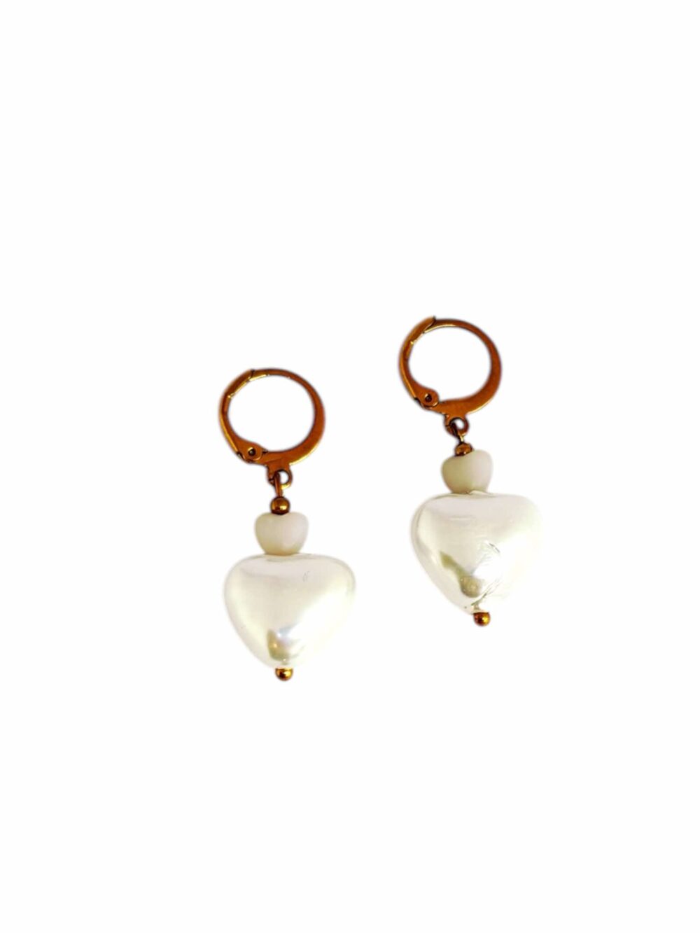 Χειροποιήτα σκουλαρίκια απο ανοξείδωτο ατσάλι. Κρικάκια , κρέμεται μια πέρλα σε σχήμα καρδιάς .