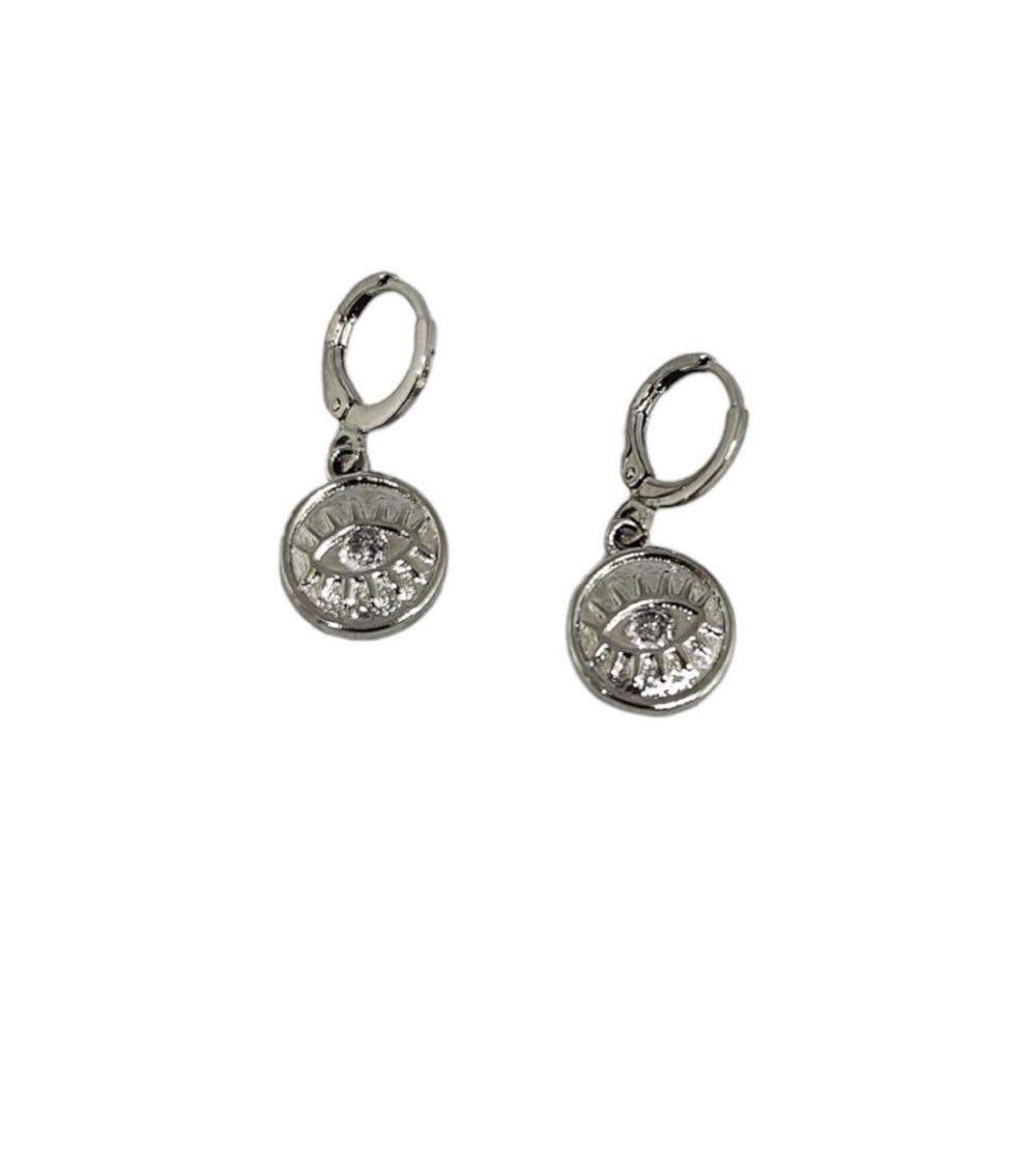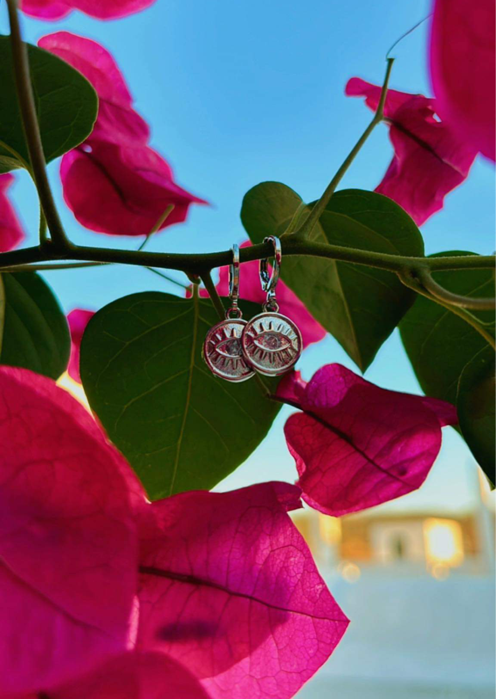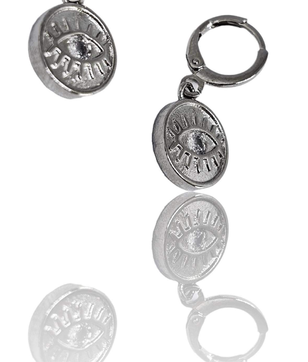 Χειροποιήτα σκουλαρίκια , απο οικολογικό ορύχαλκο. Κρικάκια με μοτίφ μάτι , με ζιργκόν.