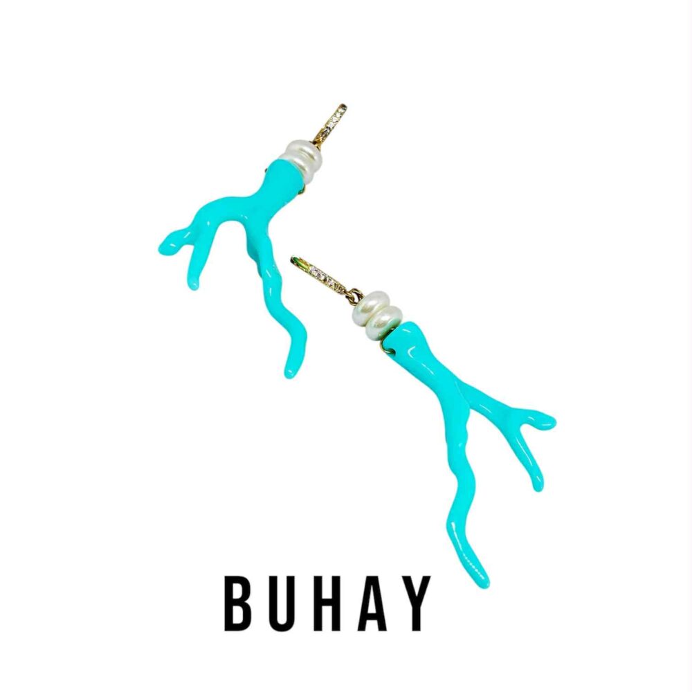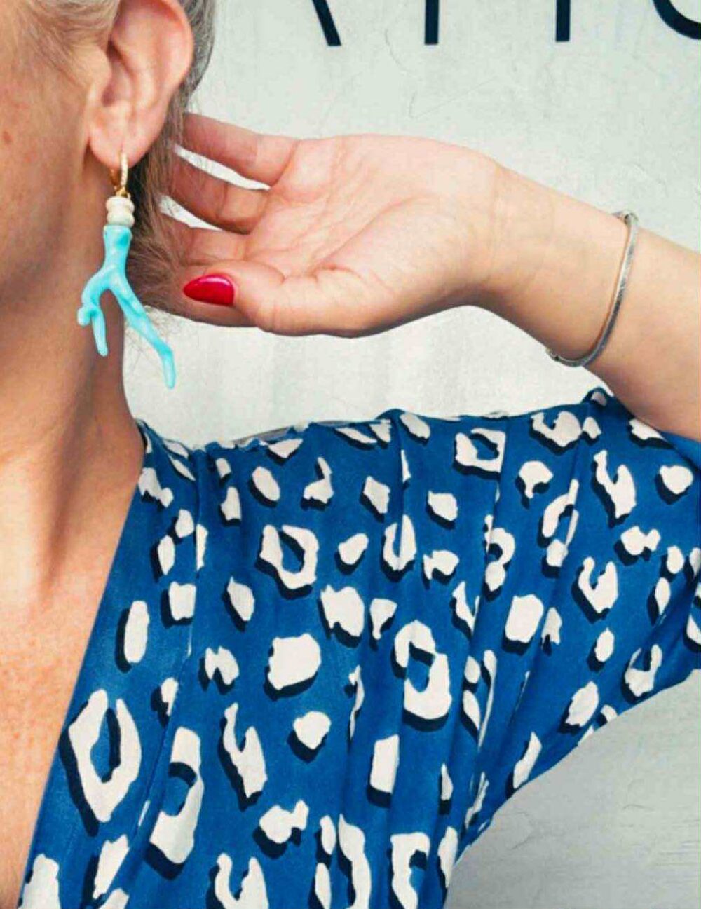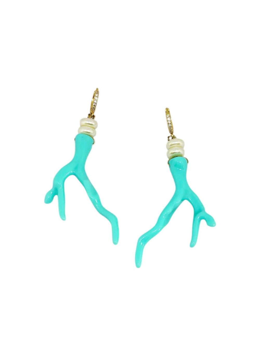 Χειροποιήτα σκουλαρίκια με απομίμηση κοραλιού σε τιρκουάζ χρώμα με ροδέλες πέρλας και κρικάκια με ζιργκόν , απο οικολογικό ορύχαλκο.