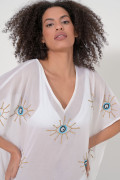 Βαμβακερό καφτάνι με επαναλαμβανόμενο μοτίβο από μεγάλα μάτια. Ανοιχτό ντεκολτέ. Μανίκι ενιαίο. Ίσια τετράγωνη γραμμή με πλαινά ανοίγματα και κρεμαστά tassel. Σύνθεση : 100% COTTON