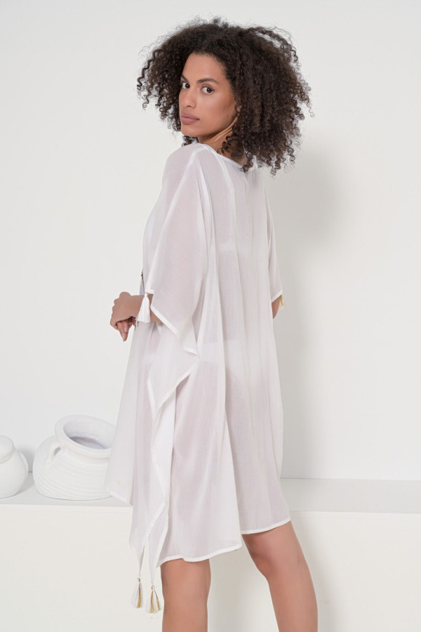 Βαμβακερό καφτάνι με μοτίβο απο ενα μεγάλο μάτι. Ανοιχτό ντεκολτέ. Μανίκι ενιαίο.Ίσια τετράγωνη γραμμή με πλαινά ανοίγματα και κρεμαστά tassel.