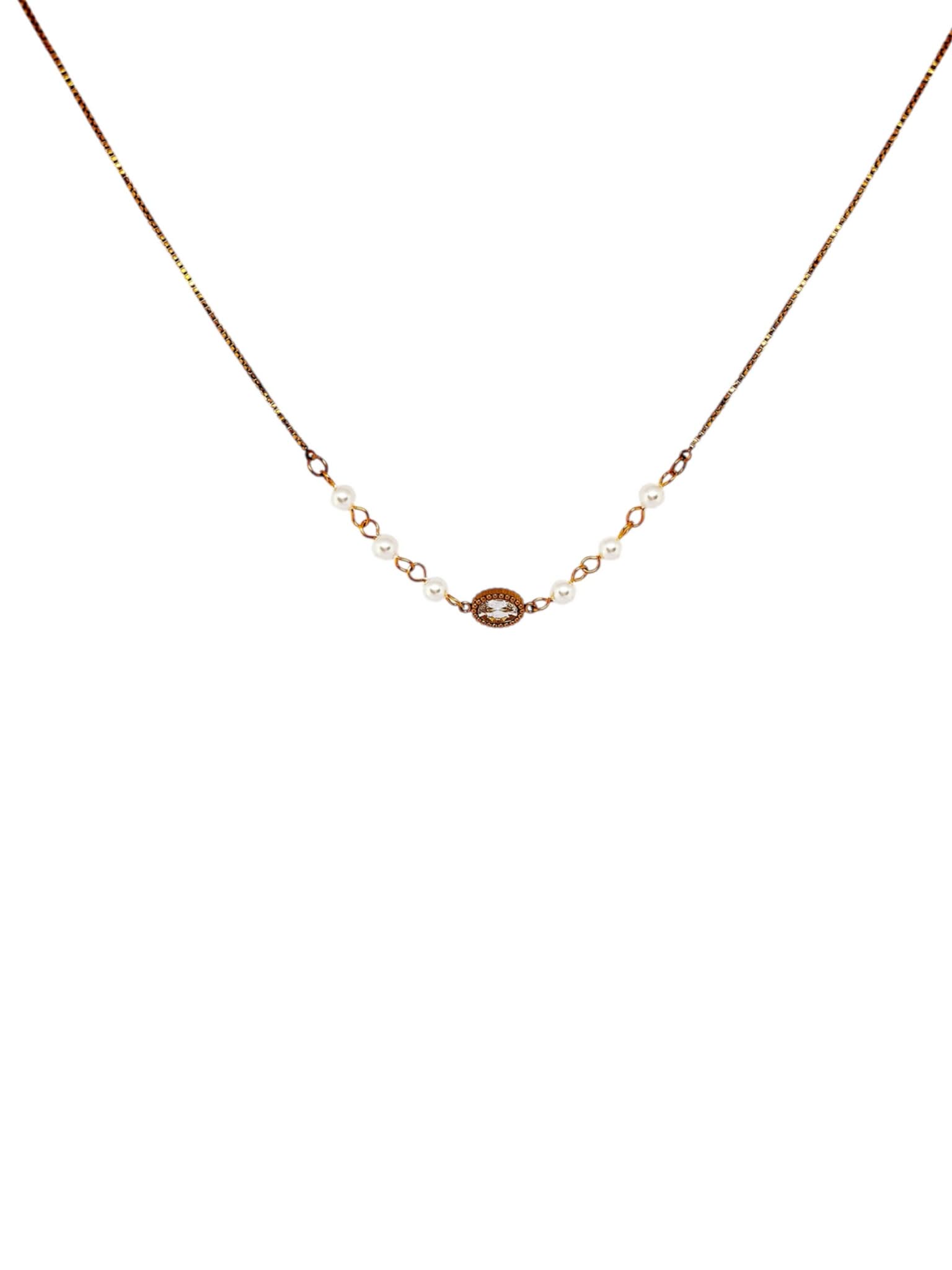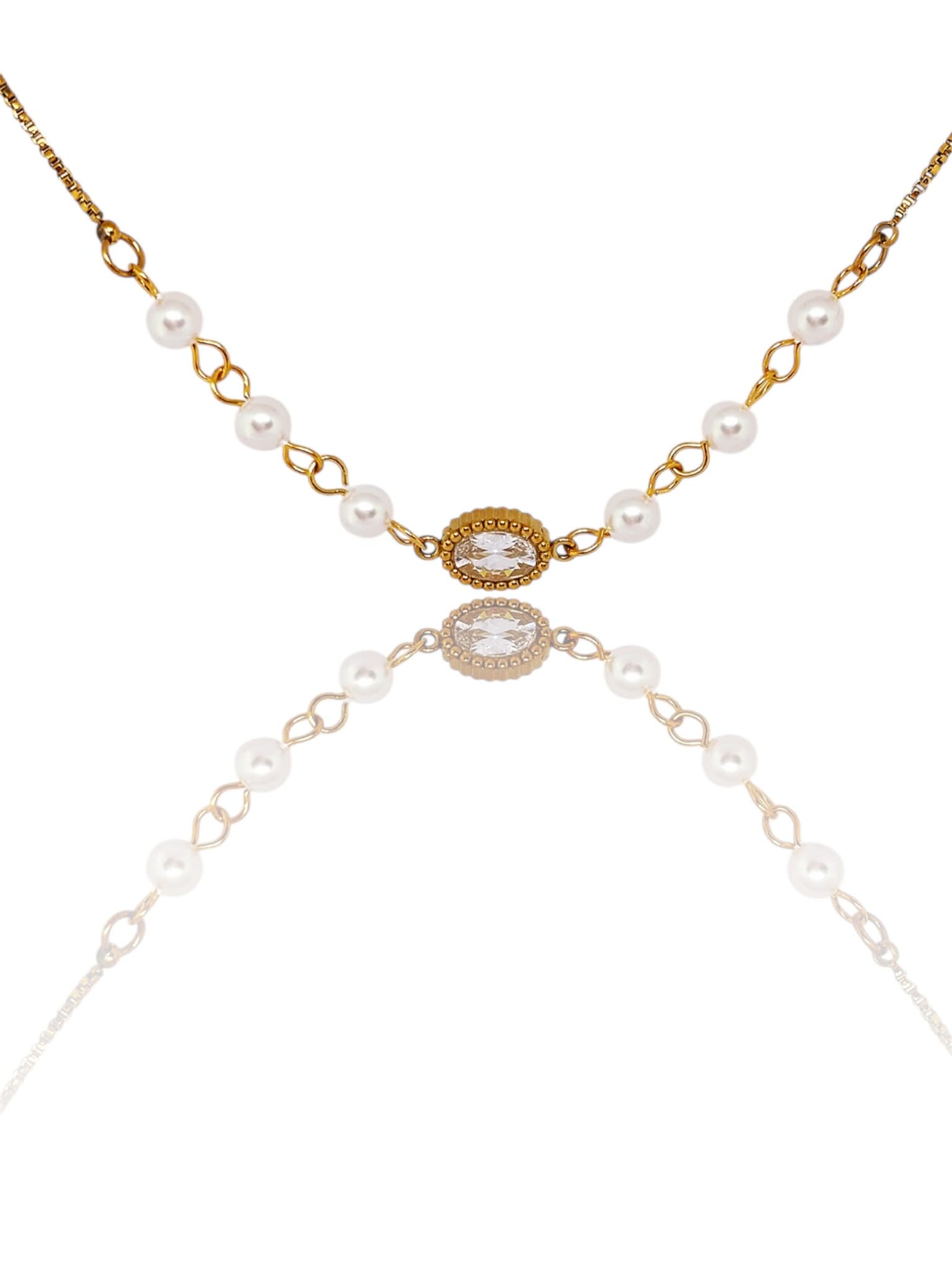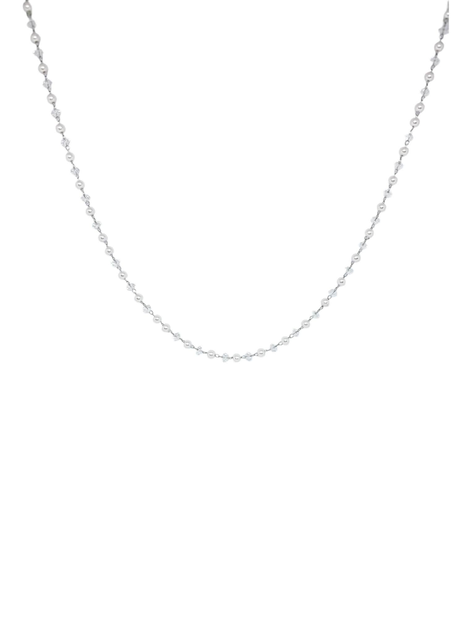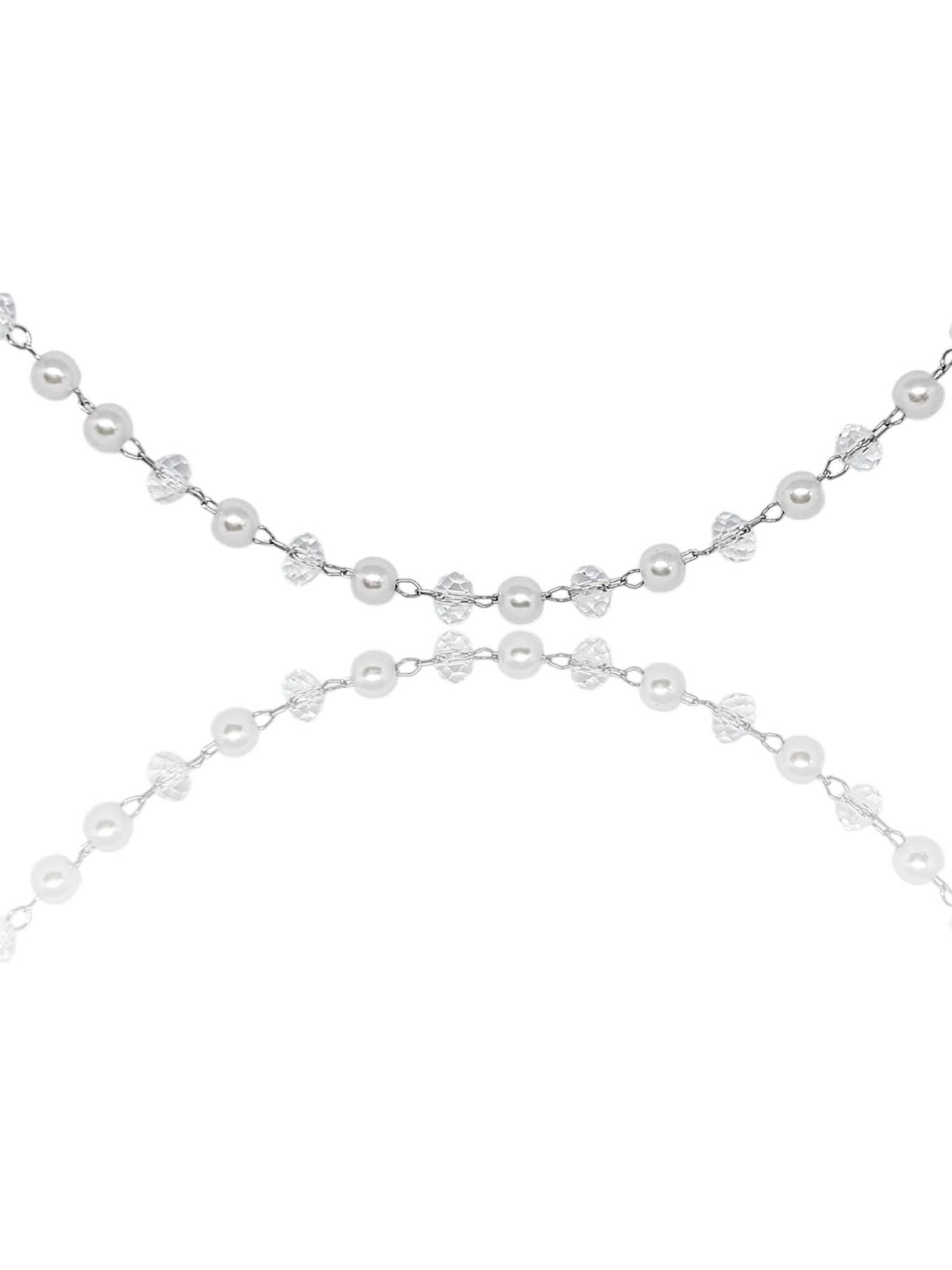 Χειροποίητο κολιέ απο ανοξείδωτο ατσάλι. Κολιέ τύπου ροζάριο με εναλλασόμενες λευκές πέρλες και διάφανα κρυσταλλάκια σε ασημί αλυσίδα. Ιδανικό για layering ή μόνο του. Delicate και feminine.
