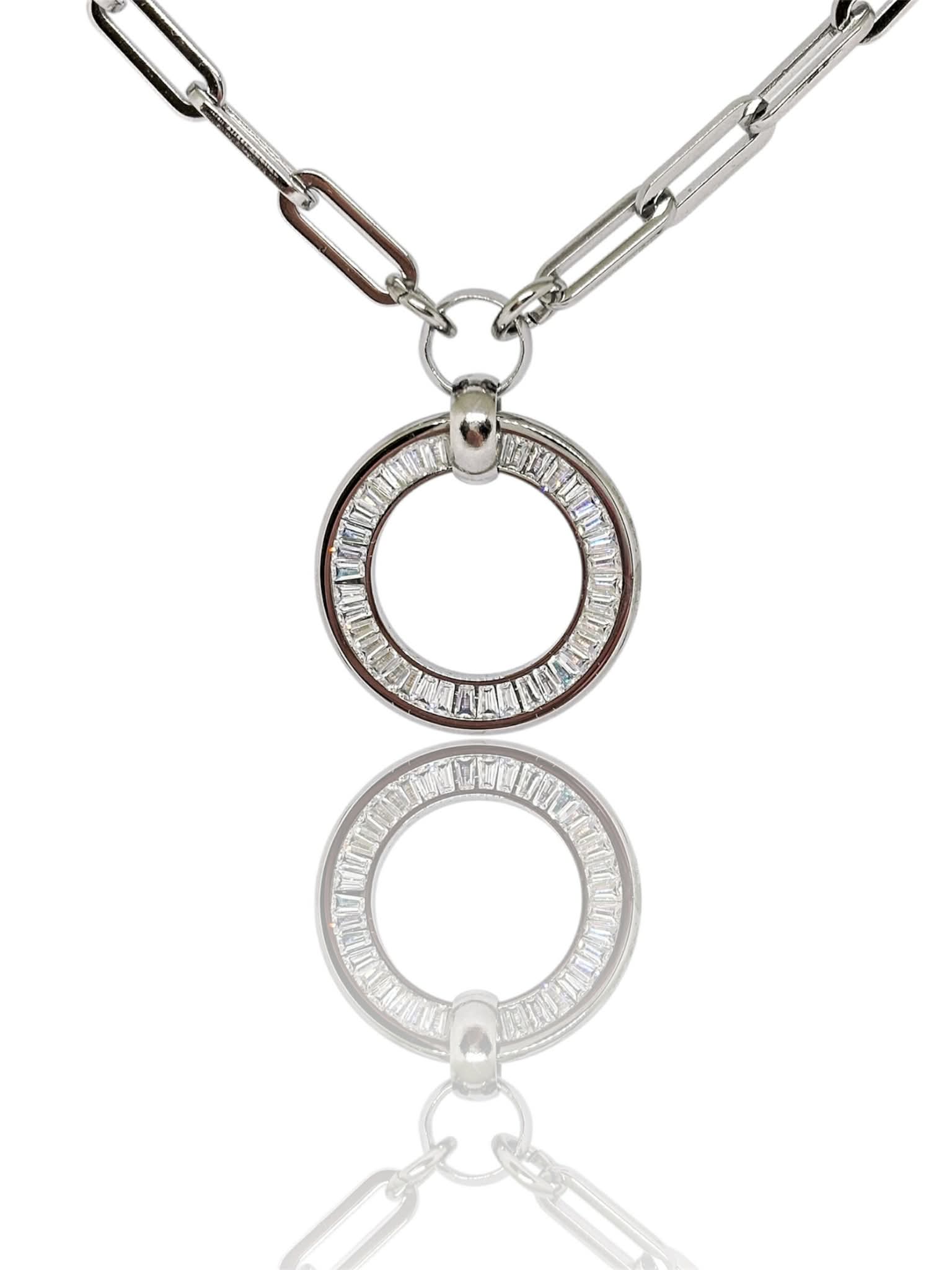 Κολιέ απο ανοξείδωτο ατσάλι. Μικτή αλυσίδα δυο τύπων , στρογγυλοί κρίκοι στο πάνω μέρος και ορθογώνιοι (paperclip) κρίκοι στο κέντρο , οπου δένει με κυκλικό μενταγιόν σε ανοιχτό σχέδιο με baguette ζιργκόν περιμετρικά που δίνουν έντονη λάμψη.