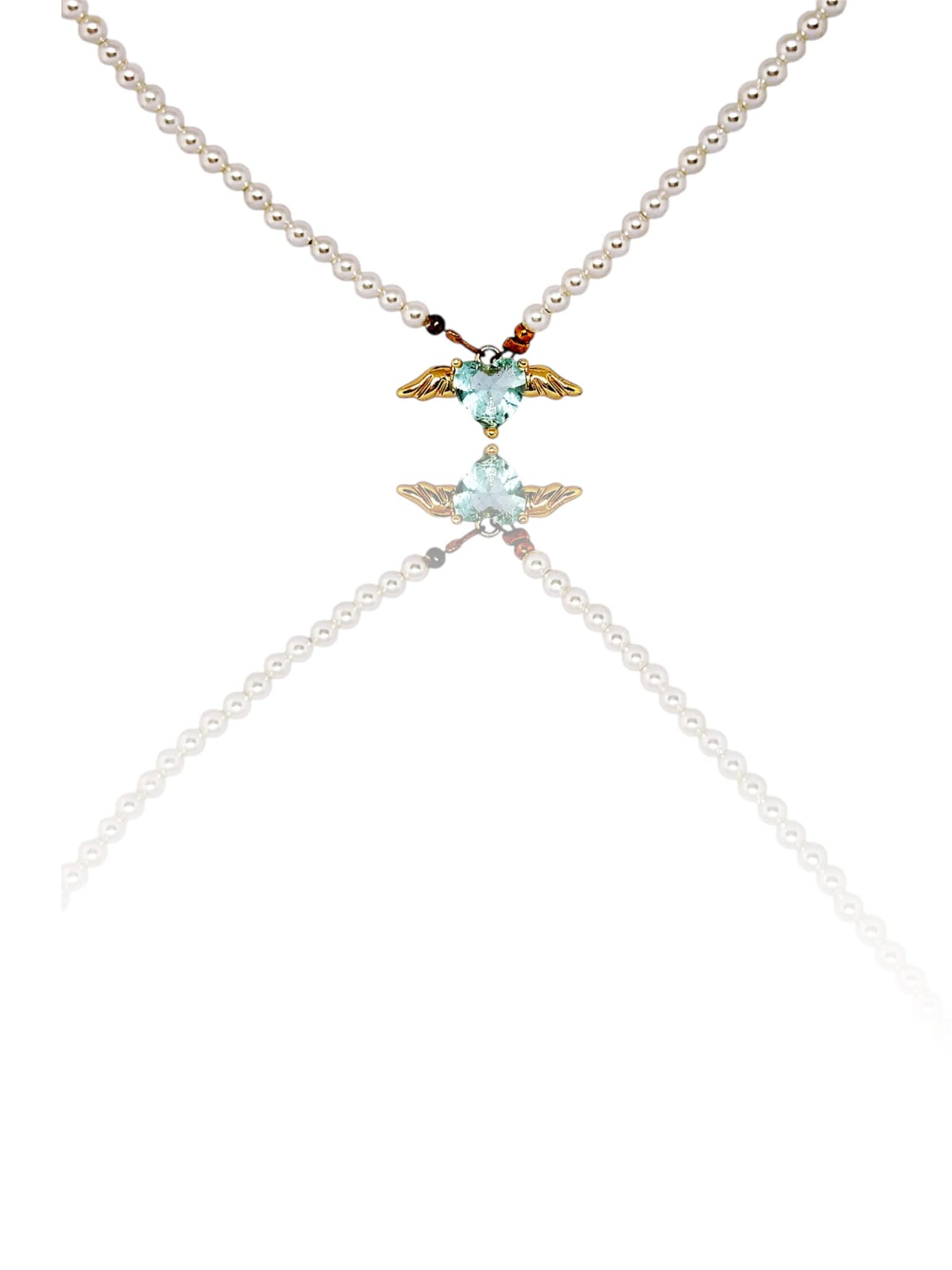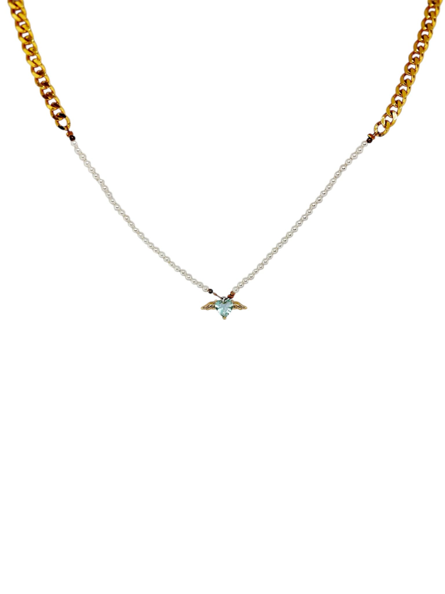 Χειροποιήτο κολιέ , απο οικολογικό ορείχαλκο , επιχρυσωμένο. Καδένα μέχρι τη μέση , μετα συνεχίζει με περλίτσες και στο κέντρο έχει μοτίφ καρδιά με γαλάζιο ζιργκόν.