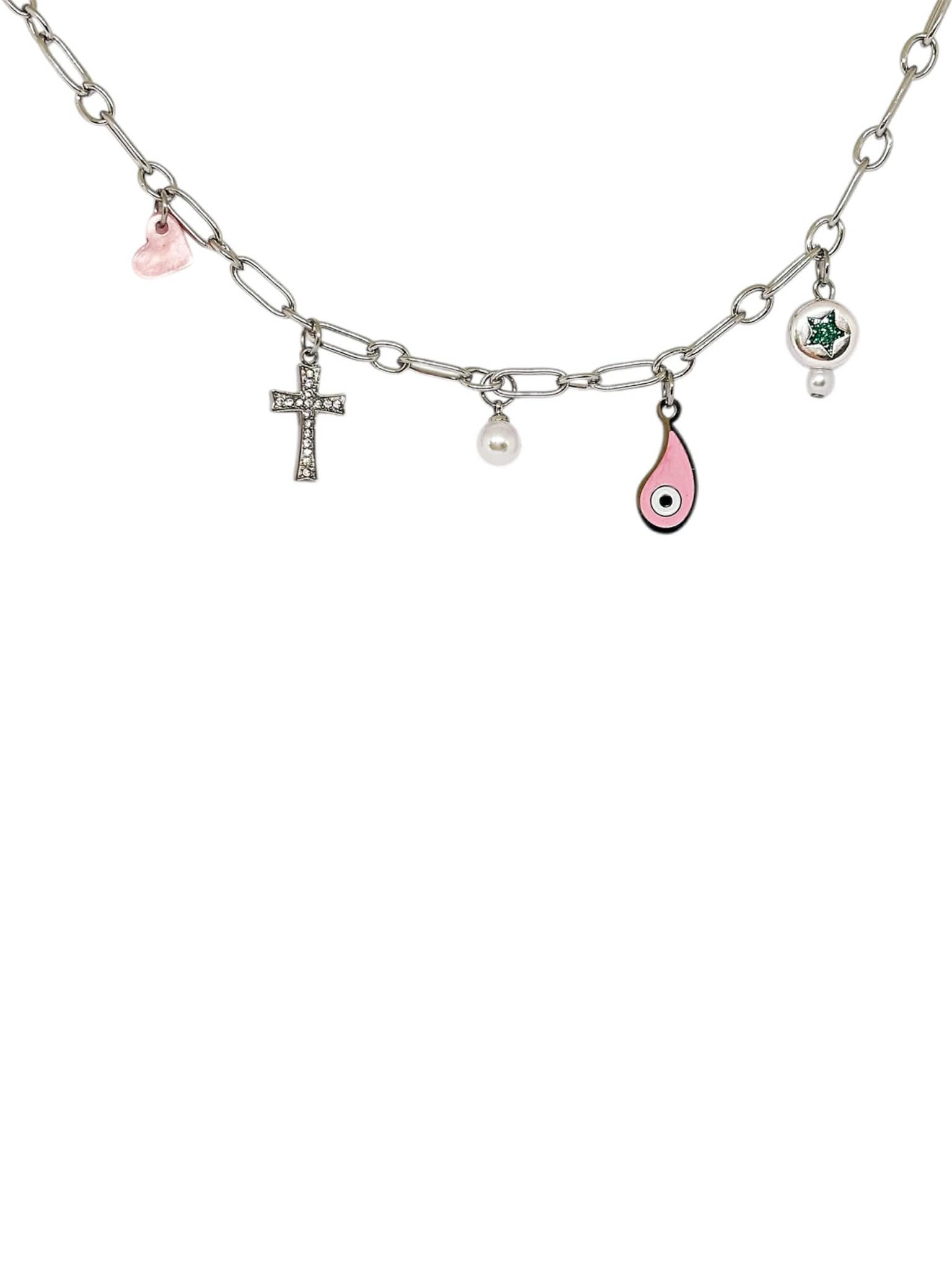 Χειροποίητο κολιέ απο ανοξείδωτο ατσάλι.Αλυσίδα paperclip με 6 διαφορετικά charms . Ροζ καρδιά , σταυρός με ζιργκόν , ρόζ μάτι , αστέρι με στράς και pearl . Κάθε charm εχει το δικό του στύλ.