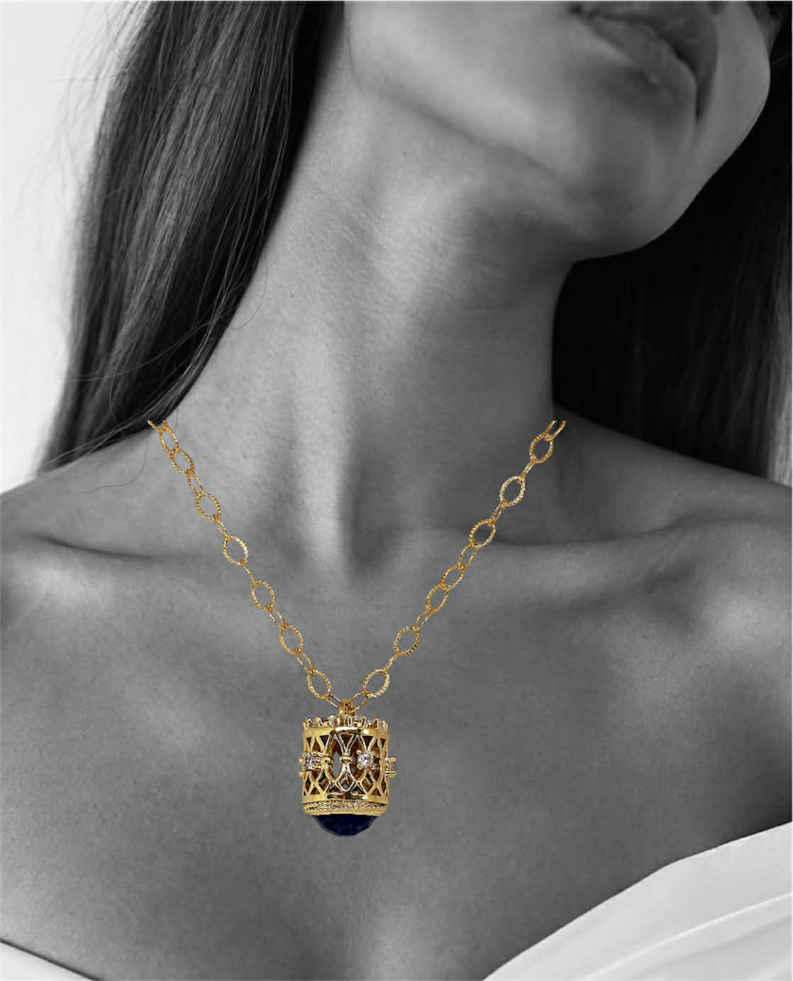 Χειροποιήτο κολιέ απο οικολογικό ορείχαλκο επιχρυσωμένο με filigree κύλινδρο που ‘φυλακίζει’ μέσα του , ορυκτό lapis lazulli με ζιργκόν λεπτομέρειες.Λεπτή αλυσίδα με ανάγλυφους κρίκους.
