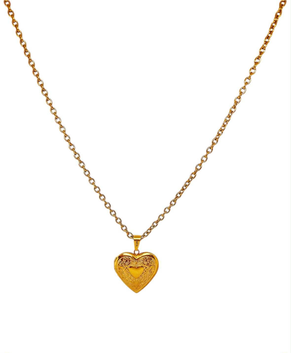 Κολιέ απο ανοξείδωτο ατσάλι , επιχρυσωμένο. Αλυσίδα rolo , μακριά για extra λεπτομέρεια. heart locket μενταγιόν με floral σχέδιο , που ανοίγει για να τοποθετήσεις φωτογραφία.
